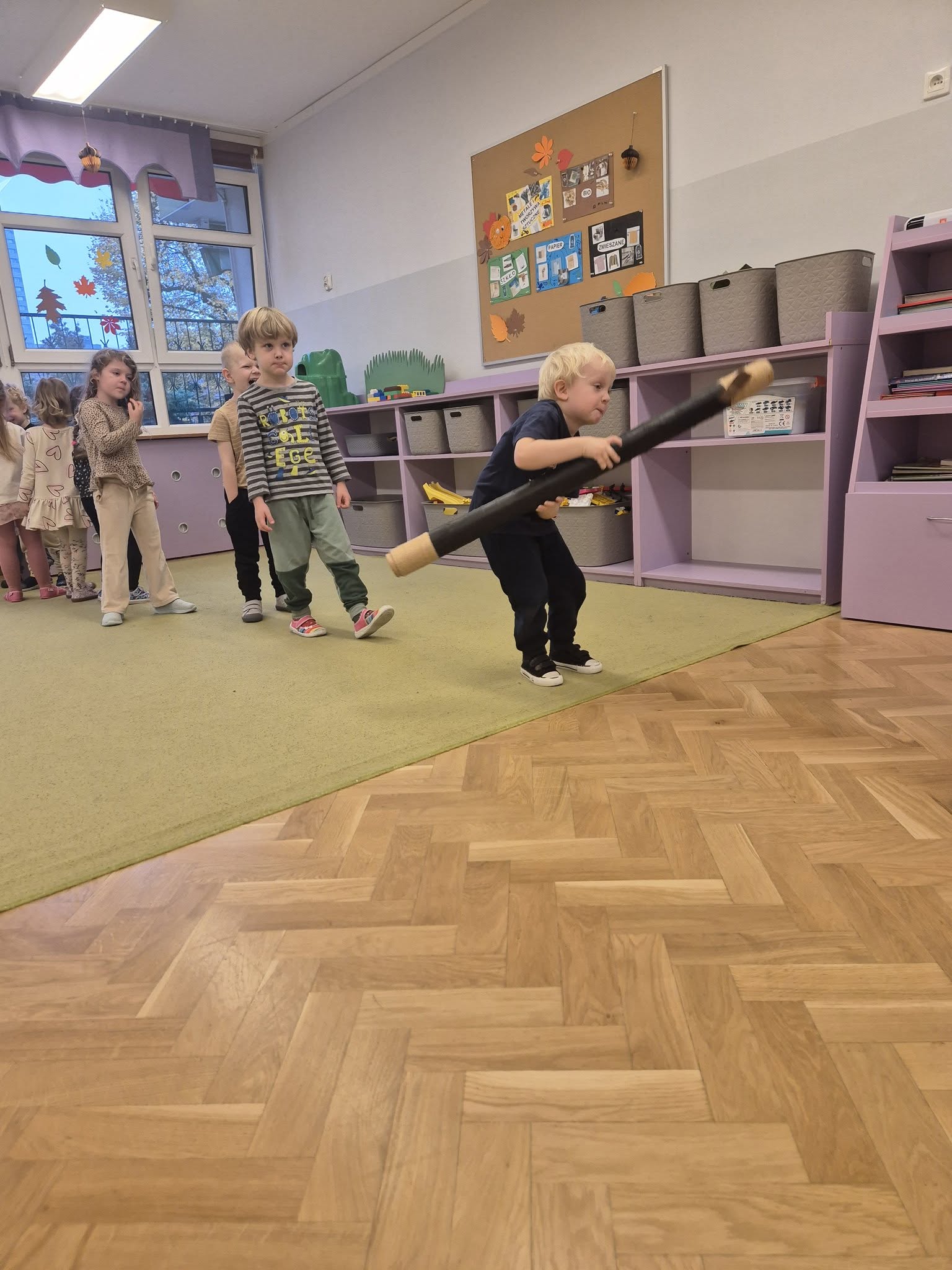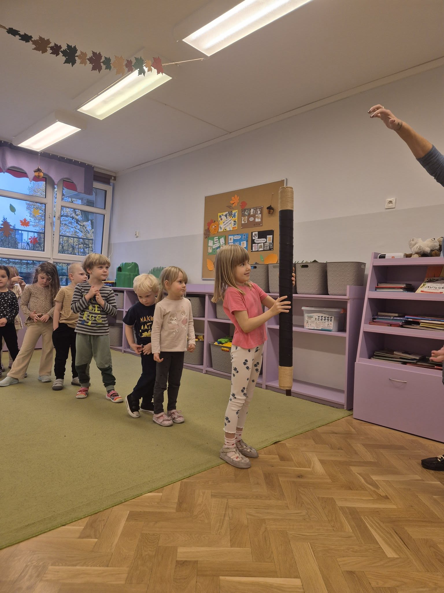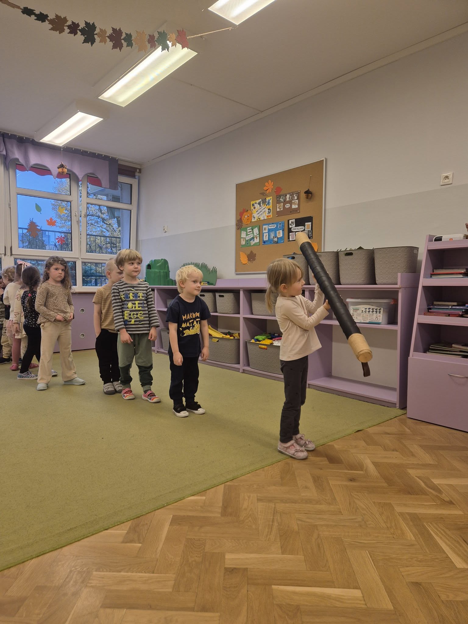 Dzieci świetnie się bawiły i z ogromnym zainteresowaniem poznawały nowy instrument – kij deszczowy.