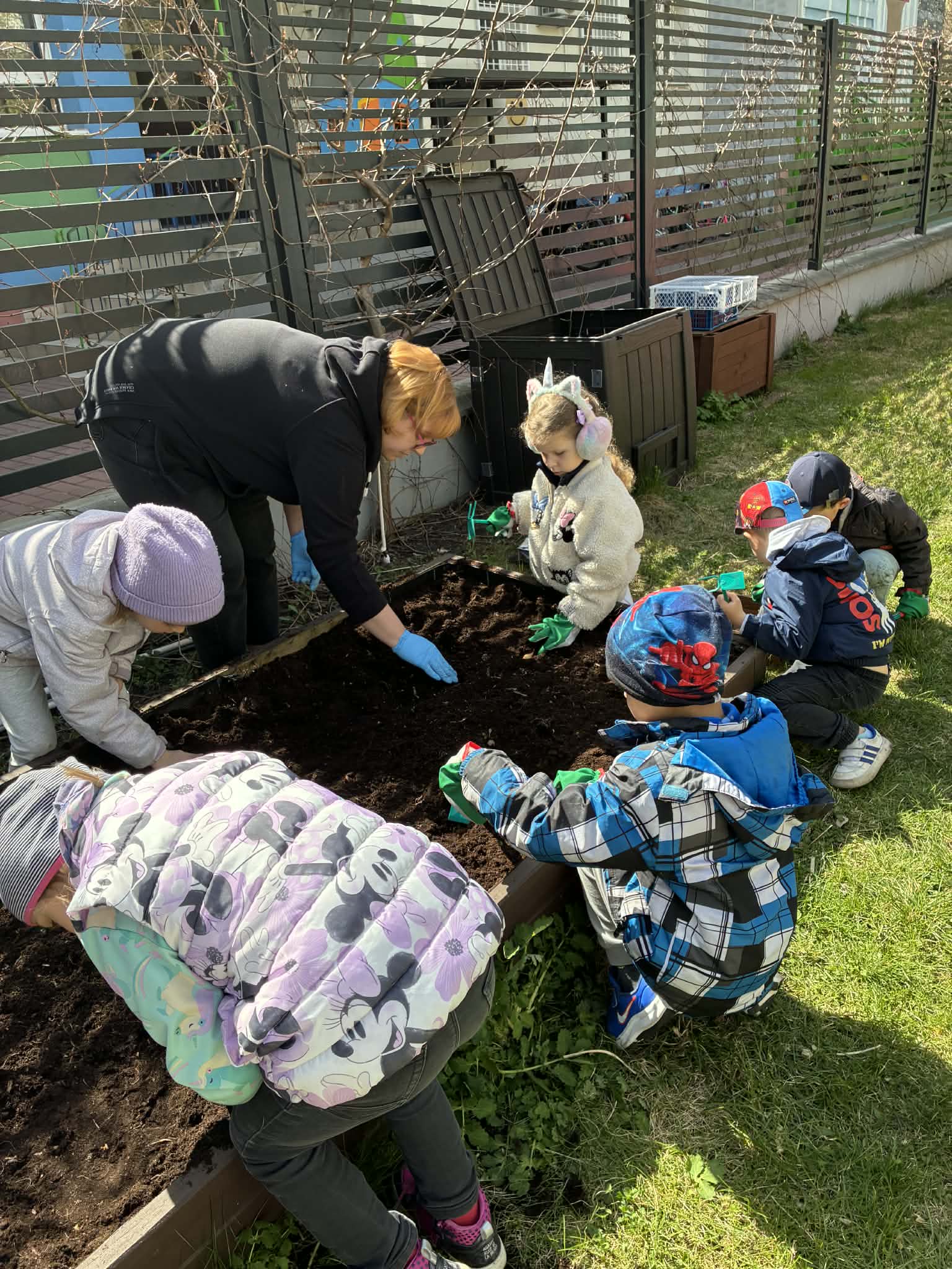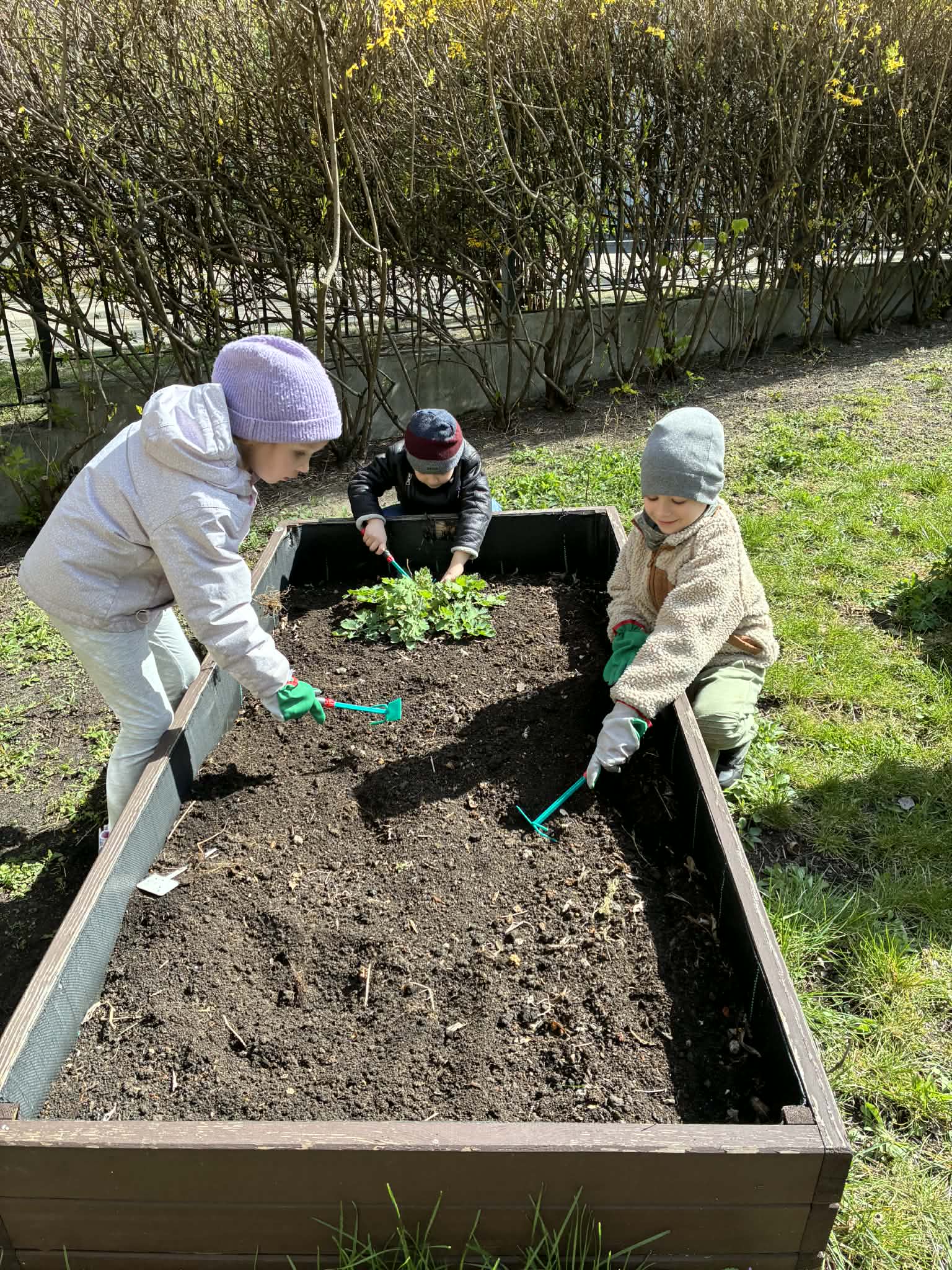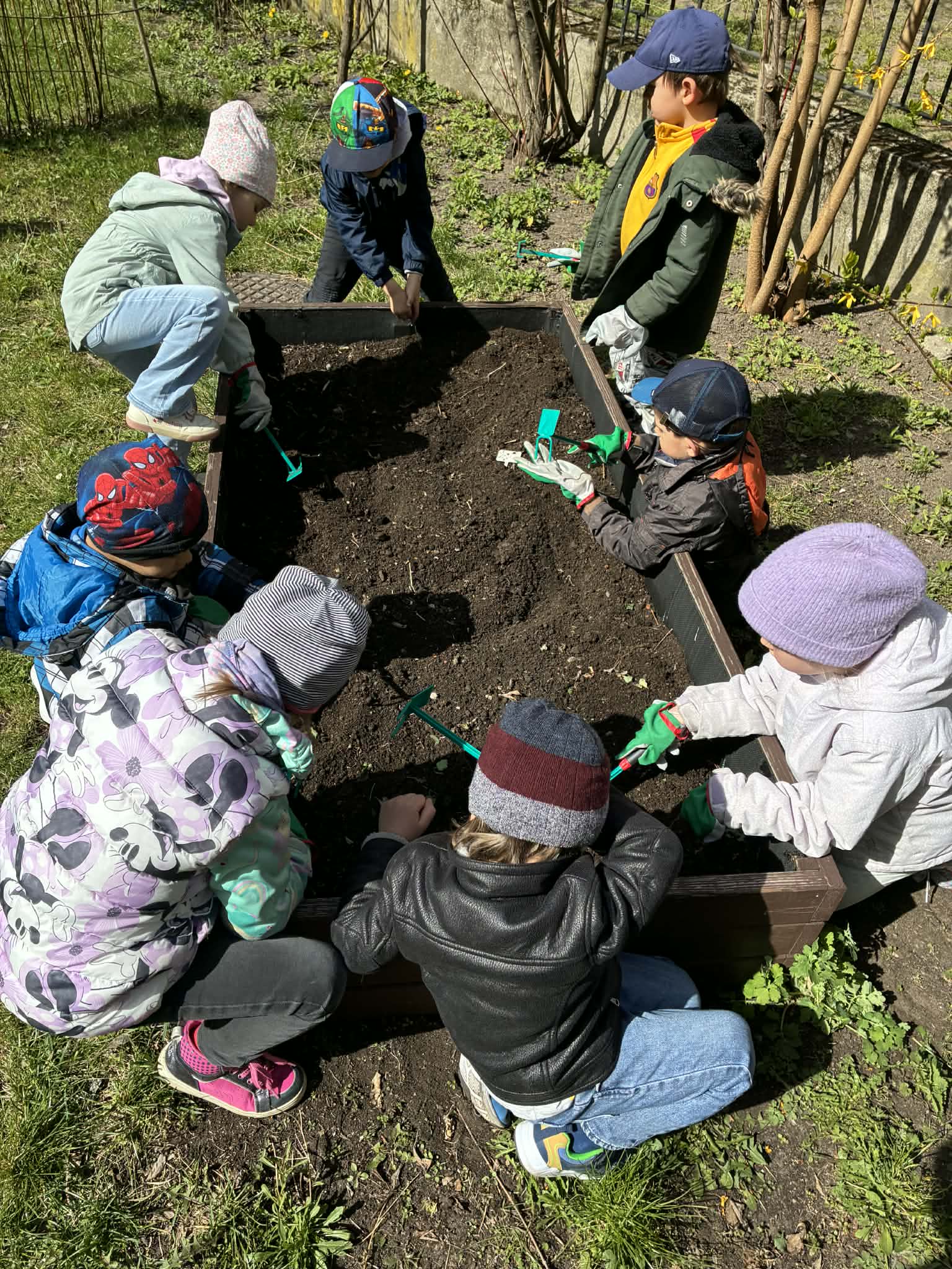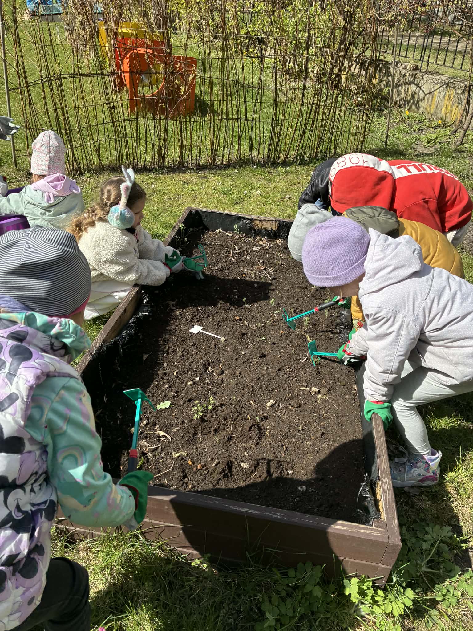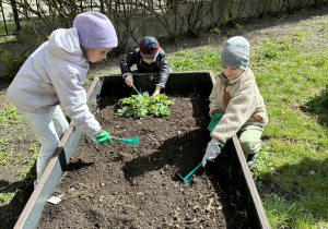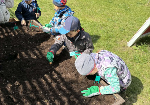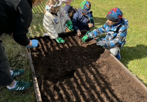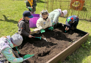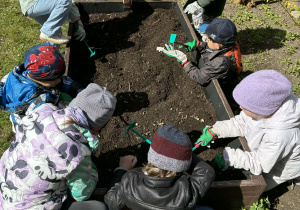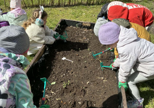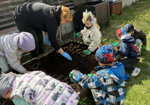 Dzieci rozpoczęły od wiosennych porządków na grządkach. Było przekopywanie ziemi, wyrównywanie, przygotowywanie miejsca pod nowe rośliny – a wszystko to z dużą uważnością i radością odkrywania. Każde ziarenko, każda grudka ziemi była ważna.