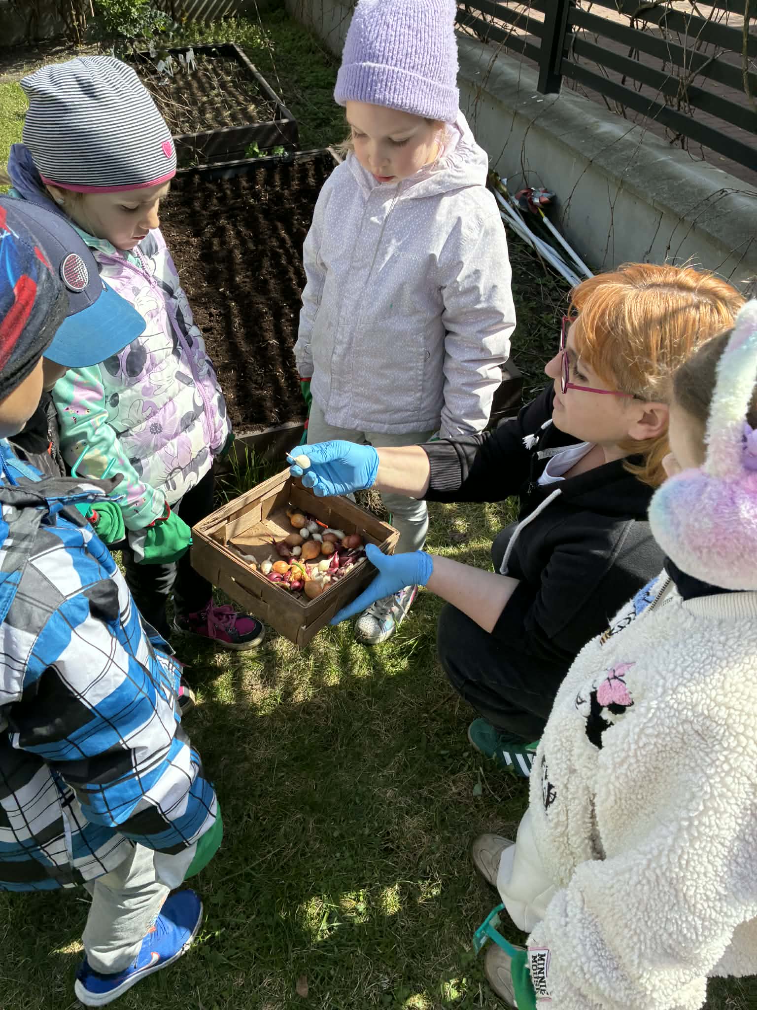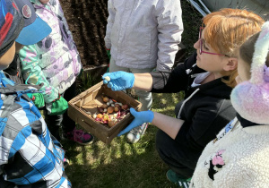 Następnie przyszedł czas na sadzenie cebulek. To moment, który zawsze budzi szczególne emocje – bo choć jeszcze nic nie widać, wiemy, że pod ziemią zaczyna się coś niezwykłego. Dzieci z ciekawością obserwowały, jak z małej cebulki może wyrosnąć coś pięknego.