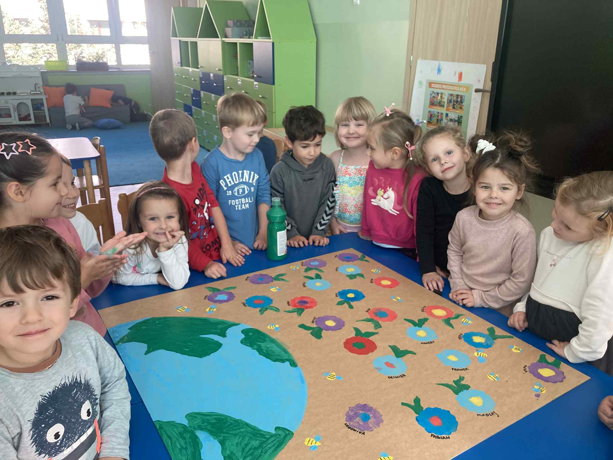Każdy przedszkolak stworzył własny „list do Ziemi” – pełen kolorów, rysunków i dziecięcych przesłań. W pracach pojawiły się prośby o czyste powietrze, zdrowe lasy, czystą wodę i troskę o zwierzęta.