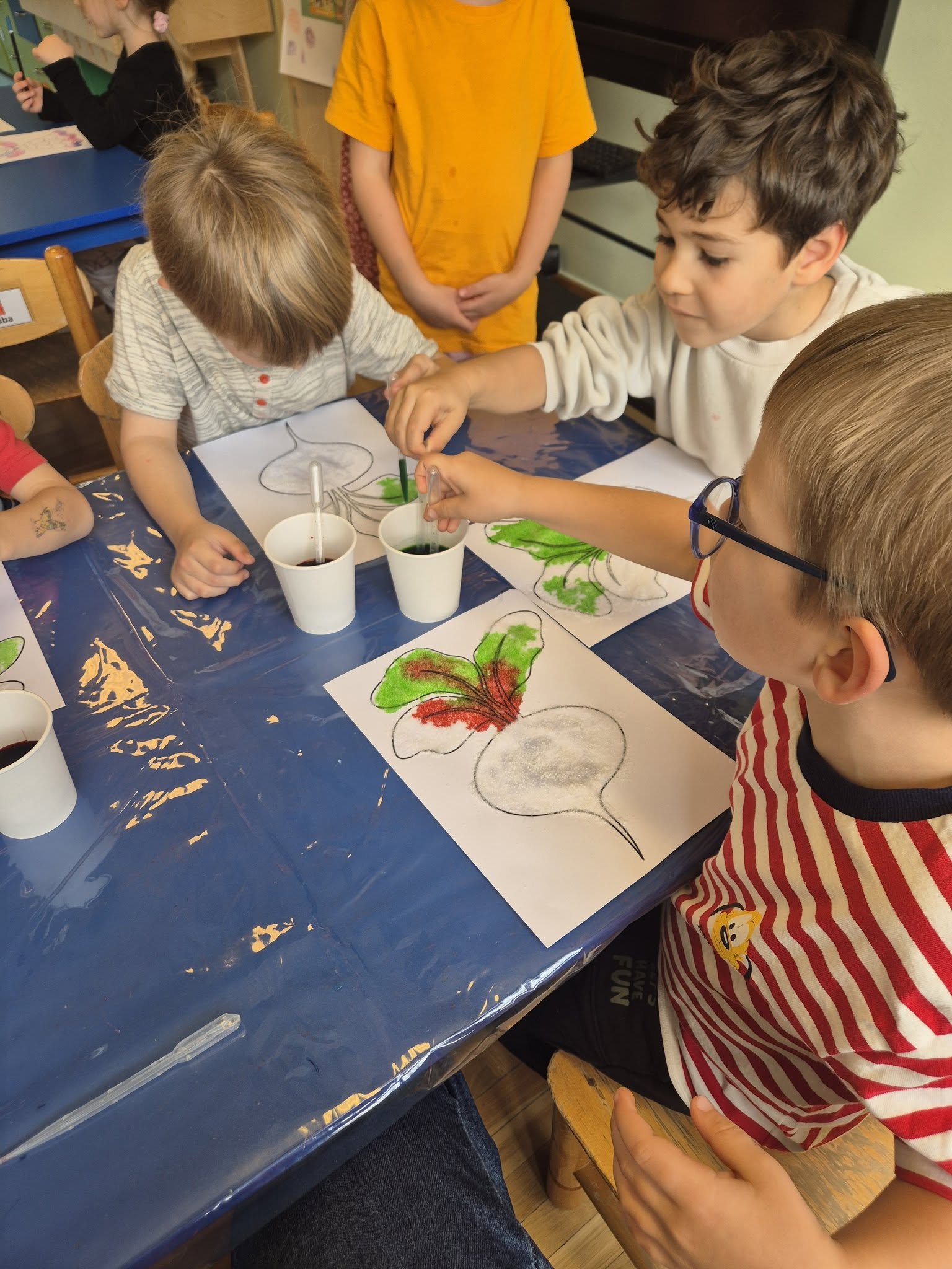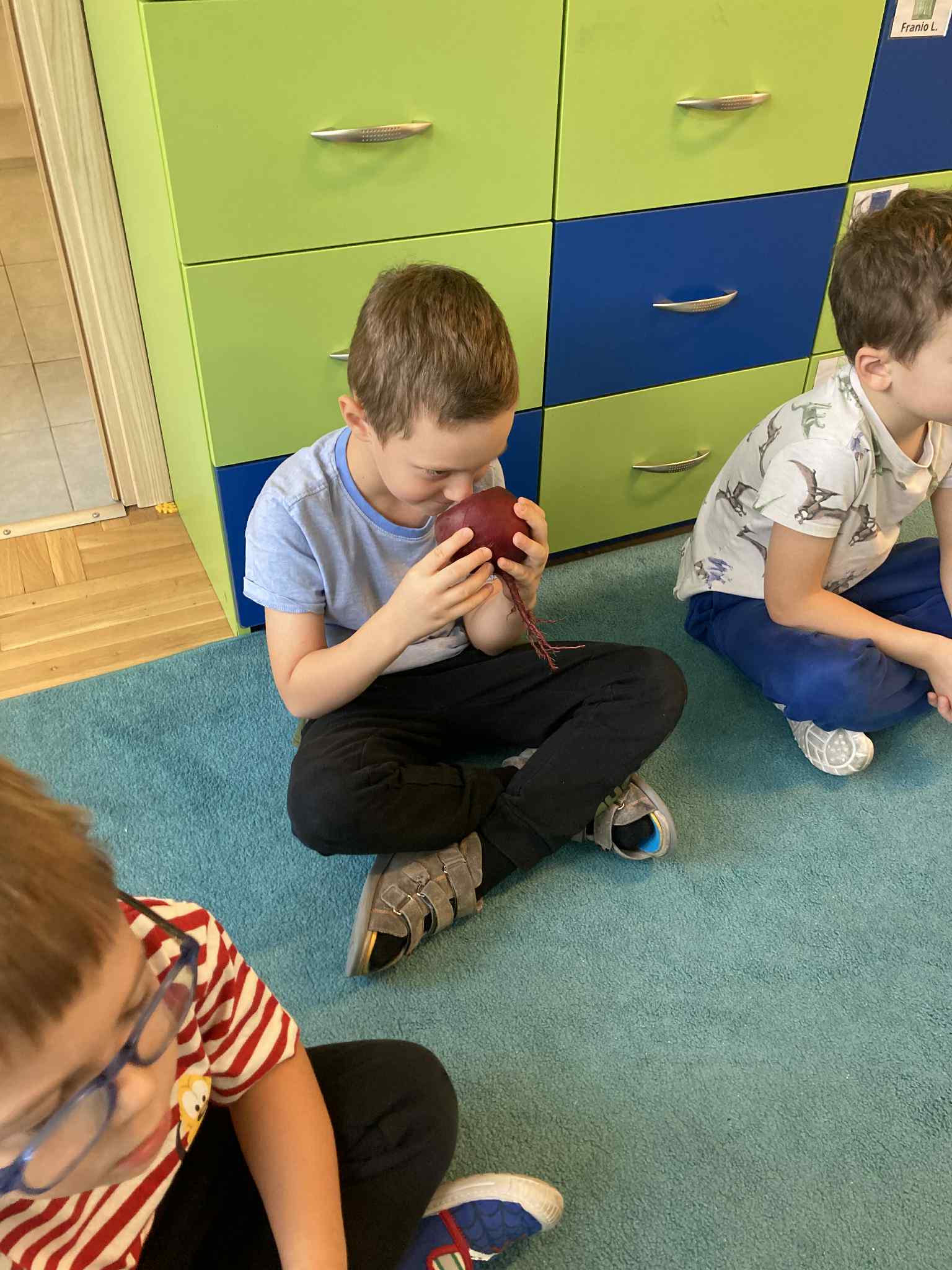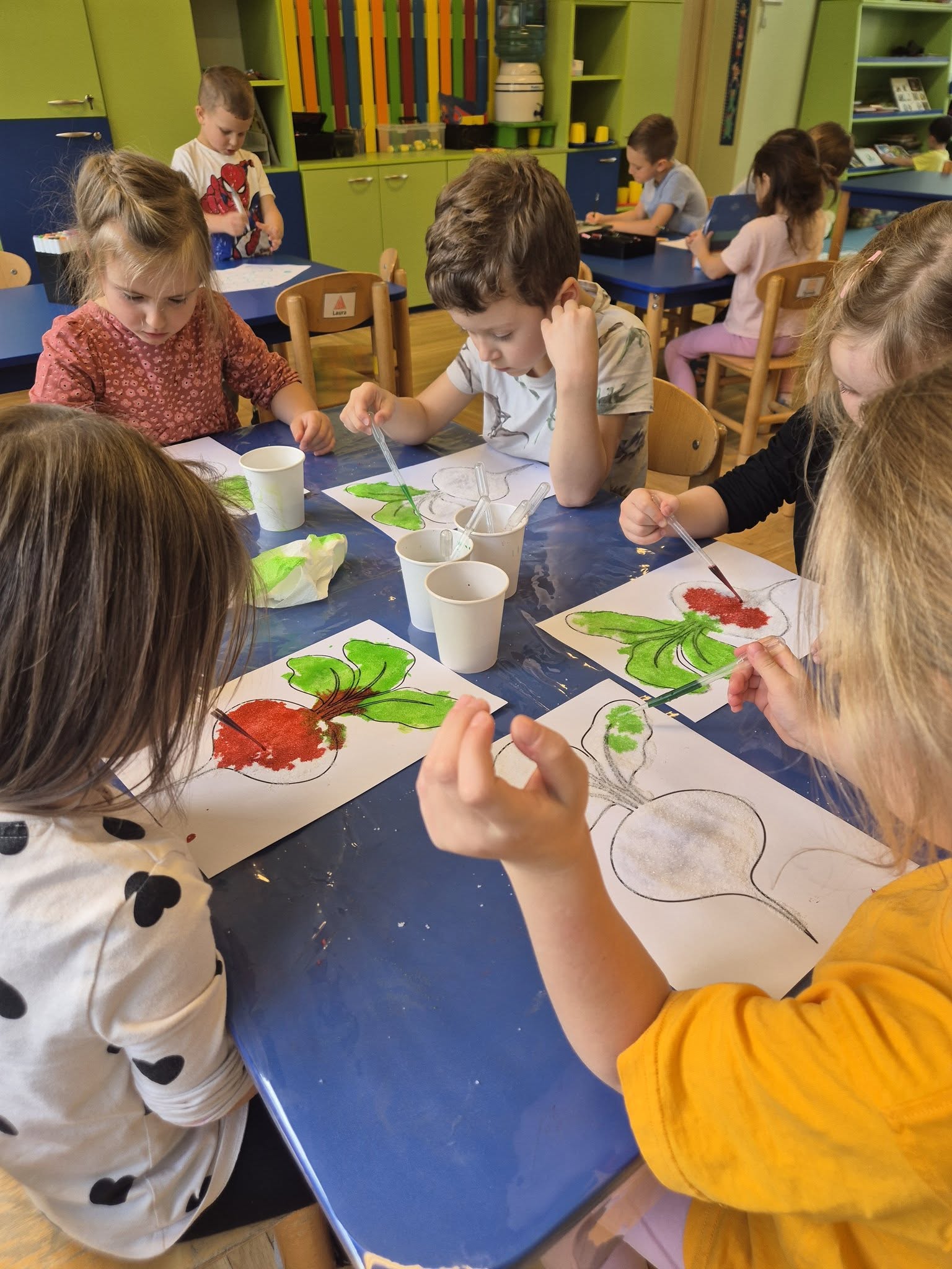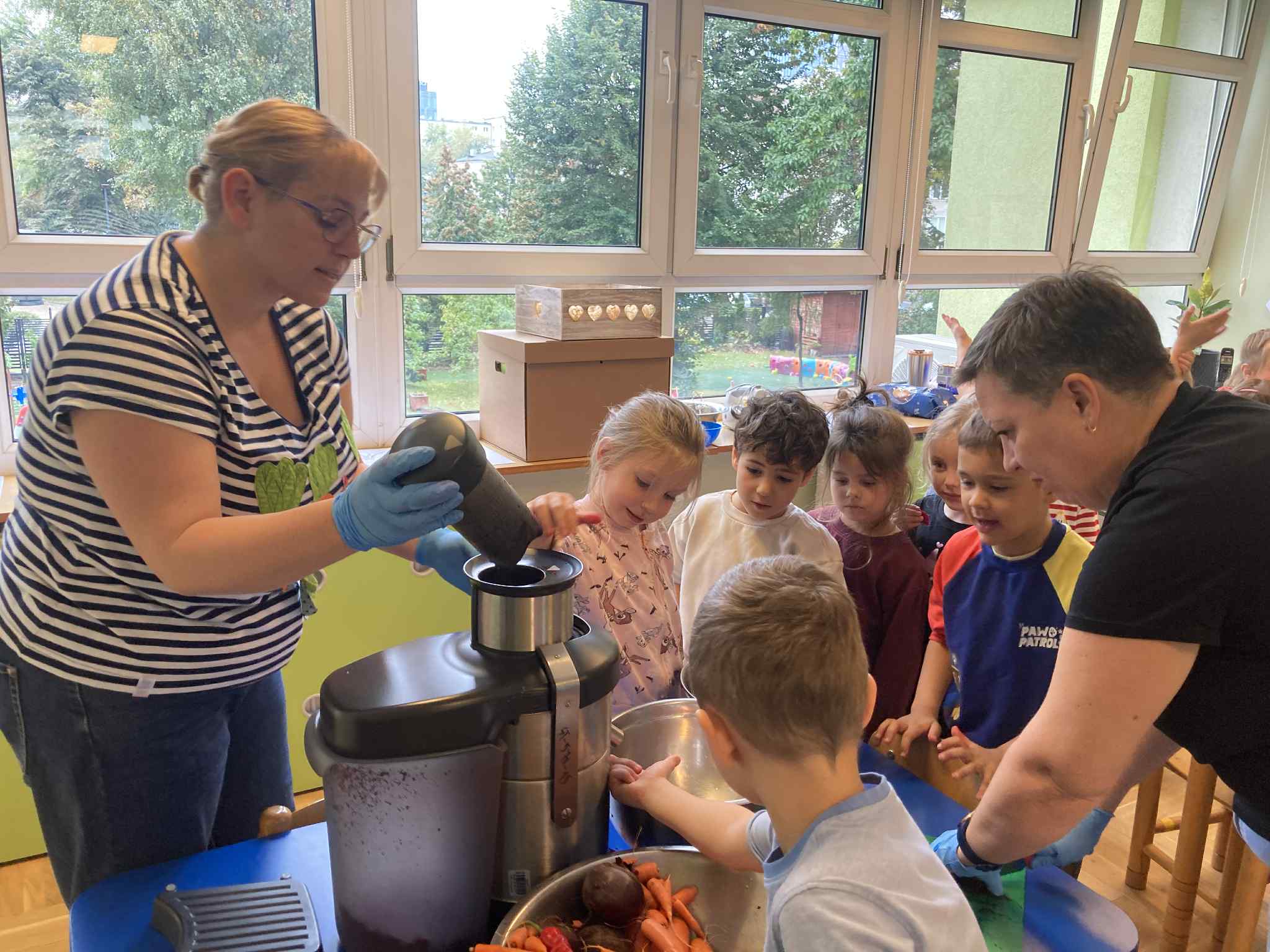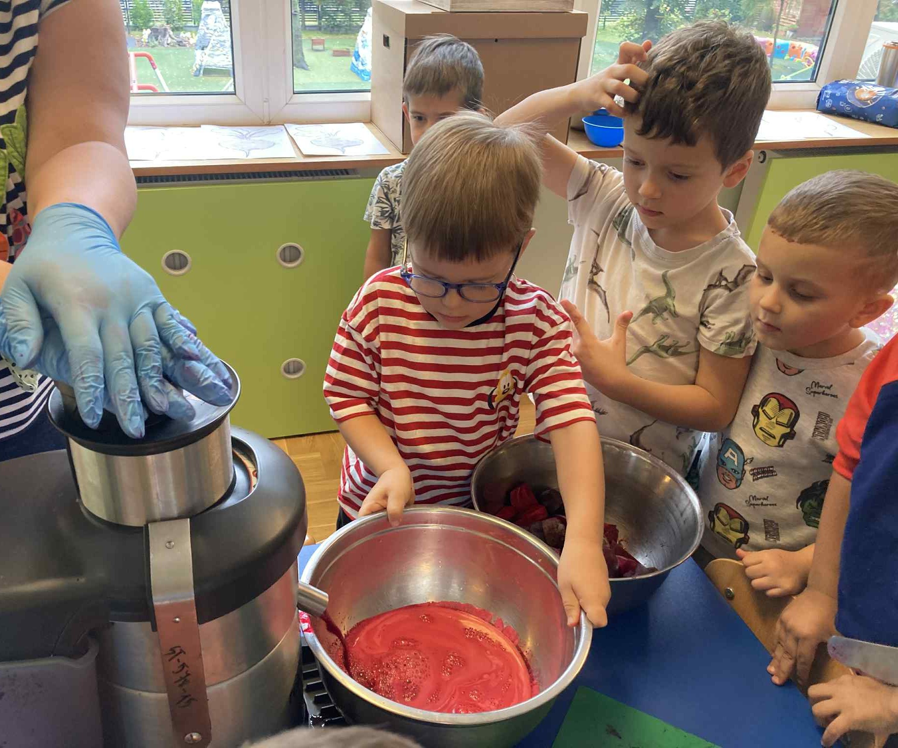 Nie zabrakło też eksperymentów w kuchni – samodzielnie przygotowaliśmy sok z buraka! Było trochę emocji, trochę śmiechu i mnóstwo czerwonych rąk (i ust ). Po degustacji pojawiły się najpiękniejsze buraczkowe uśmiechy, które trudno było zmyć, ale łatwo było pokochać!